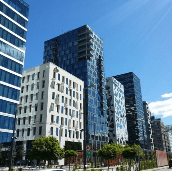 Nach unserem Frühstück auf dem Dach des Opernhauses erkundeten wir die Stadtteile am Wasser. Hier in den ersten Reihen am Oslofjord fallen vor allem die vielen modernen Glasbauten auf. Dazu zählen nicht nur offensichtlich der Bahnhof und das Opernhaus, sondern auch Straßen wie der Barcode und die dahinterliegende Fußgängerbrücke über die Bahngleise. Seinen Namen bekam der Barcode durch die unterschiedlich hohen und schmalen Gebäude, in denen sich Büros, Wohnungen, Restaurants und Läden befinden und die an einen Barcode erinnern.