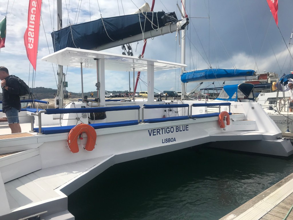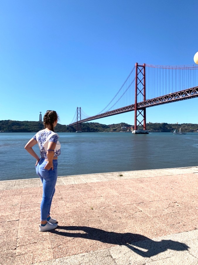 Frisch gestärkt geht es zurück in den Hafen, genauer gesagt zum Doca do Bom Sucesso. In dieser kleinen Marina am Turm von Belem liegen die Boote von Taguscruises. Wir haben vorab einen einstündigen Segeltörn für knapp 23 EUR gebucht und bei dem Preis ein entsprechend einfaches Segelboot erwartet. Als uns der Kapitän aber auf den für uns riesigen Katamaran bat, waren wir alles aber überrascht und beeindruckt. Auf dem Netz dieses Katamarans zu liegen machte mich schon glücklich, da hatte sich der Ausflug schon gelohnt. Umso schöner war es dann mit der Kulisse, vom Turm von Belem unter der Brücke Ponte 25 de Abril hindurch und wieder zurück. Die Crew war unglaublich freundlich, hat sich mit uns unterhalten und den Törn sogar um eine halbe Stunde verlängert.