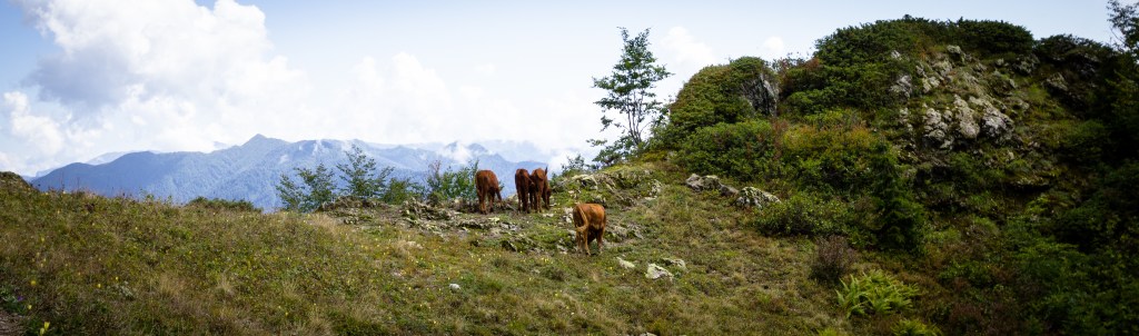 Den kleinen Abzweig vom Waldweg zu finden und auf den eigentlichen Trek zu kommen, war gar nicht so einfach. Wir waren froh endlich den Teil zu verlassen, in dem der Weg von Waldarbeiten geprägt war. Es war wie ein magisches Tor, das in eine wunderschöne und unberührte Landschaft führte. Wir mussten kleine Passagen klettern und Wasserfälle überqueren. Nach einem längeren Aufstieg kamen wir an eine kleine Hütte, in der ein Mann ganz allein lebte. Er hat uns zum Essen eingeladen, nur war es dafür einfach noch zu früh und es war noch ein ganzes Stück bis zum ersten See. Einige Meter höher sind wir seinen Kühen begegnet und mit ihnen auf die Felsen geklettert, um die Aussicht zu genießen.