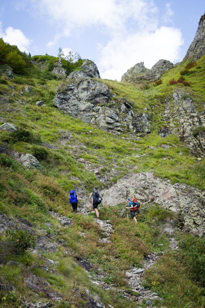 Die Aussicht war zweifellos überall wunderschön. Hinter uns der weite Blick in den Kaukasus und vor uns sah der Berg aus wie eine Mondlandschaft. Trotzdem war es extrem anstrengend, mit unserer kompletten Ausrüstung mussten wir allein heute 2000 Höhenmeter überwinden. Der Weg war eigentlich gekennzeichnet, manchmal konnte man die Markierungen aber einfach nicht finden. Ich kam mir vor als wollte man mir sagen „du musst da hoch, du kommst nicht drum herum“. An manchen Stellen brauchten wir dann aber doch die App, auf der Marco die Strecke per GPS gespeichert hatte.