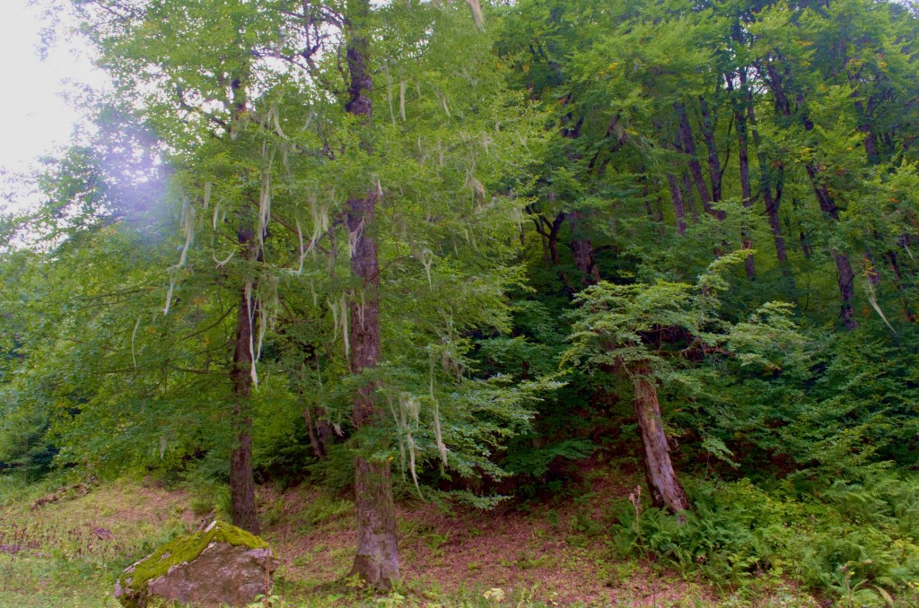 Am Nachmittag kamen wir in einen merkwürdigen Wald. Von den Bäumen hing Moos und mehrere Bäume lagen qualmend am Boden, wie nach einem Blitzeinschlag. Aber alle auf einmal? Im gleichen Wald begegnete uns ein Mann mit seinem Esel. Das klingt wie ein Märchen, ich weiß. Wir waren uns auch nicht sicher was er wollte, zumindest hat er uns ein Zeichen gegeben, dass er friedlich sei. Er brachte uns zu seinem Hof, wo seine Frau und deren Schwester warteten. Sie boten uns Betten und Essen an. Die Hütte war so schön warm, als sie mich herein baten, um mit ihrer Tochter zu telefonieren, denn keiner der drei sprach Englisch. So gern hätten wir das Angebot angenommen, doch erstens haben wir typisch deutsch befürchtet am Ende dafür zahlen zu müssen und zweitens mussten wir echt noch etwas Strecke schaffen.
