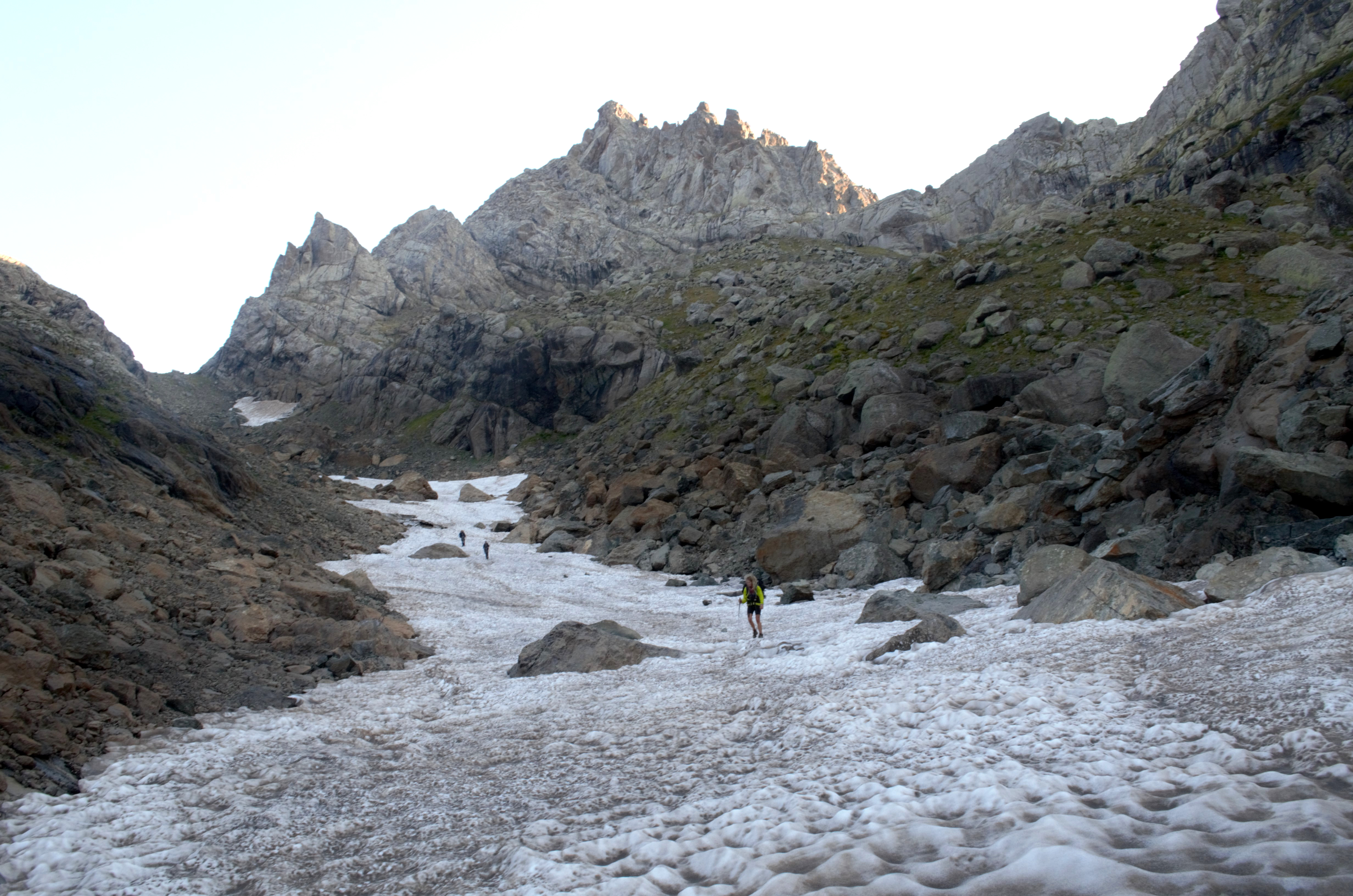 Nachdem wir unseren letzten Pass erklommen hatten, konnten wir ihn endlich sehen, den ersten Silbersee. Um uns herum riefen die Murmeltiere und zwischen uns und dem Camp lag nur noch eine ewig lange Schneezunge. Nach etwa einer Stunde hatten wir dann aber auch die hinter uns gelassen und konnten endlich die Zelte aufschlagen. Ich hatte Angst vor Bären, ich hatte Angst vor Steinschlag, aber zumindest würde es in dieser Nacht nicht kalt werden. Ich hatte mir nämlich die dicken Sachen der anderen zusammengesucht, die hatten nämlich vernünftige Schlafsäcke.