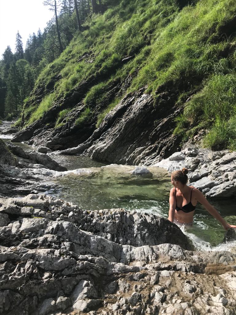 Die Schlucht war ein Zufallsfund, nachdem wir beim letzten Mal nach einem Abend im Gasthof Edeltraut noch ein kleines Stück gehen wollten. Für diese Tour solltet ihr körperlich fit und trittsicher sein. Sie ist in Walchensee Dorf ganz simpel mit einem kleinen Wegweiser ausgeschildert. Der Aufstieg dauert eine halbe Stunde, dann schaut man ein Stück nach links und rechts in die Schlucht. Spannend wird es, wenn ihr von hier aus dem Wasser zurück ins Tal folgt. Es lohnt sich in der Schlucht noch weiter aufzusteigen, aber wir sind nur noch etwa 100 Meter stromaufwärts gegangen und haben dort in den Naturpools gebadet. Von hier sind wir nicht auf dem Wanderweg, sondern mit dem Wasser zurück ins Dorf gegangen. Wir fanden kleine Wasserfälle mit Naturpools, in die wir springen konnten, und Baumstämme, über die wir balancierten. Wir haben noch gewitzelt, dass es am Ende jedes Canyonings den 10 Meter Wasserfall gibt, in den alle springen müssen. Und tatsächlich kam der 5 Meter hohe Wasserfall, an dem wir vorbei mussten. Auf vielleicht noch 3 Metern wollte ich mich nur kurz nach dem Weg umsehen, bin auf dem nassen Holz ausgerutscht und den Wasserfall heruntergefallen aber zum Glück auf den Füßen gelandet. Da weit und breit keine Menschen waren, haben wir uns nach 2 Tagen draußen unter den Wasserfällen mal ordentlich abgeduscht. Den restlichen Weg klettert man hauptsächlich über Steine, bis man am Rande des Ortes Walchensee wieder rauskommt. Diese Tour ist definitiv abwechslungsreich und abenteuerlich!