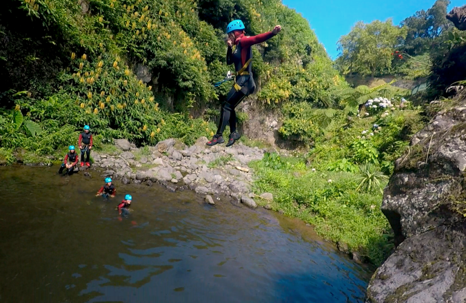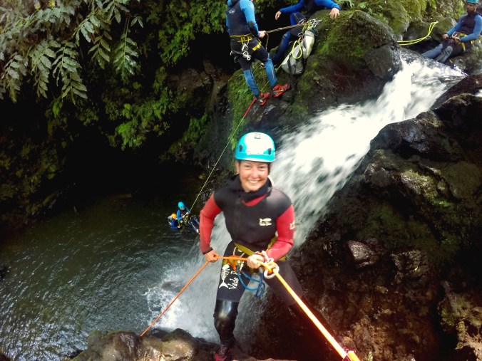 Auf São Miguel gibt es 2 Spots zum Canyoning, den Salto do Cabrito und Parque dos Caldeirões. Damit sind die Touren und Preise bei den Anbietern weitestgehend gleich. Salto do Cabrito ist bekannt für höhere Wände zum Abseilen und ist technisch anspruchsvoller. Der zweite Spot liegt unmittelbar am Erholungspark Parque dos Caldeirões und dort waren wir. Hier gibt es eine bunte Mischung aus abseilen, rutschen und springen. Wie alles solltet ihr das Canyoning rechtzeitig buchen. Wir haben 14 Tage vorher nur noch eine Halbtagestour bekommen, aber in den 3 Stunden wahrscheinlich auch die Highlights abgedeckt. Da es nur diese zwei Orte gibt, tummeln sich hier gleich mehrere Gruppen. Dadurch müsst ihr an den Hindernissen nicht nur auf eure eigene Gruppe warten, was das eigentliche Abenteuer etwas langwierig macht. Mit dem nötigen Kleingeld ist privates Canyoning eine Option. Dabei sind die Stationen wie 8 m Abseilen, Rutschen und 6 m Springen an sich sehr cool! Unsere Guides waren zwei junge Portugiesen, die nach ihrem Natursportstudium ihr eigenes Unternehmen gründeten. Aber auch die anderen Veranstalter wirkten sehr gut. Ich denke hier könnt ihr nichts falsch machen.