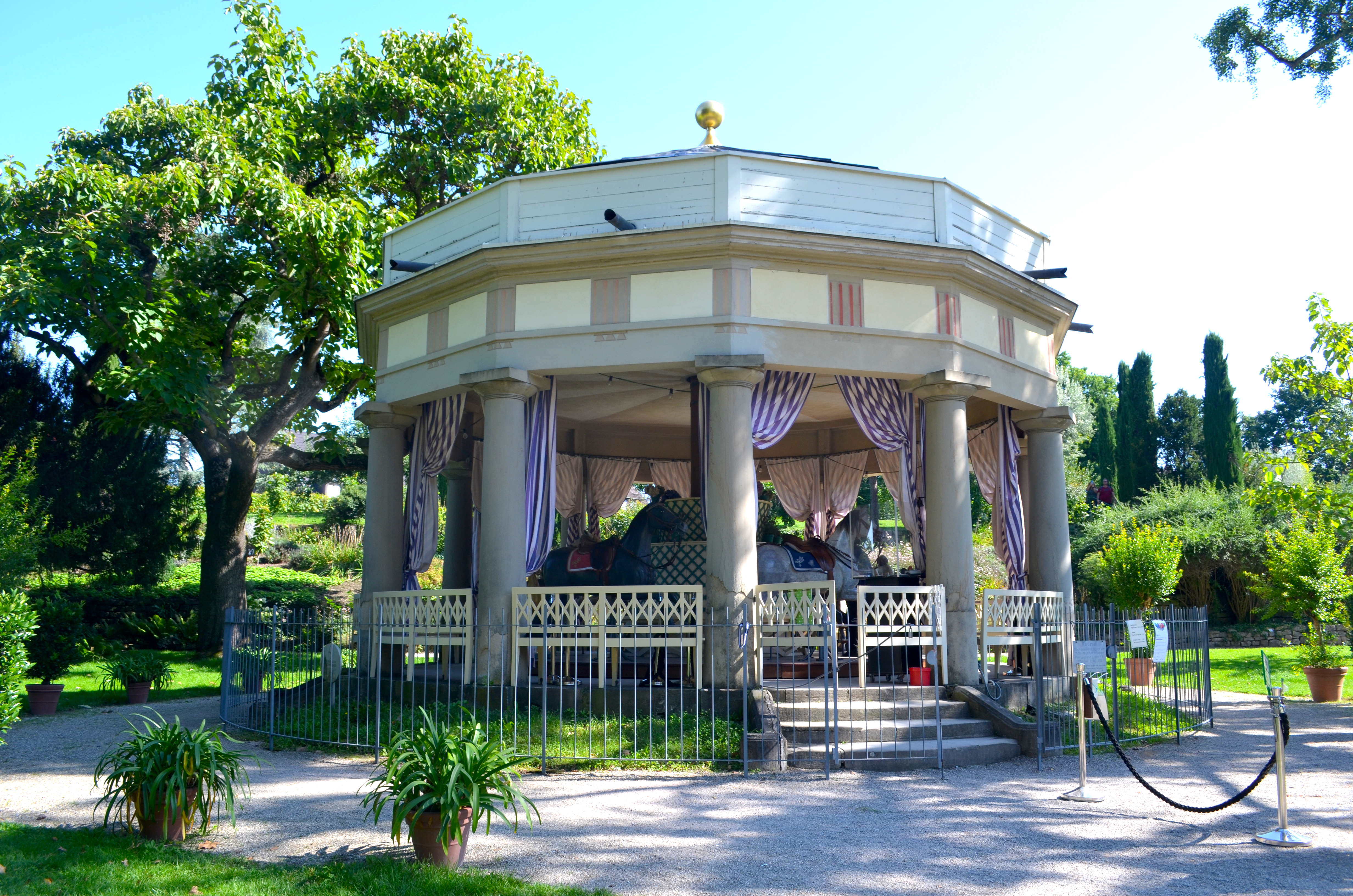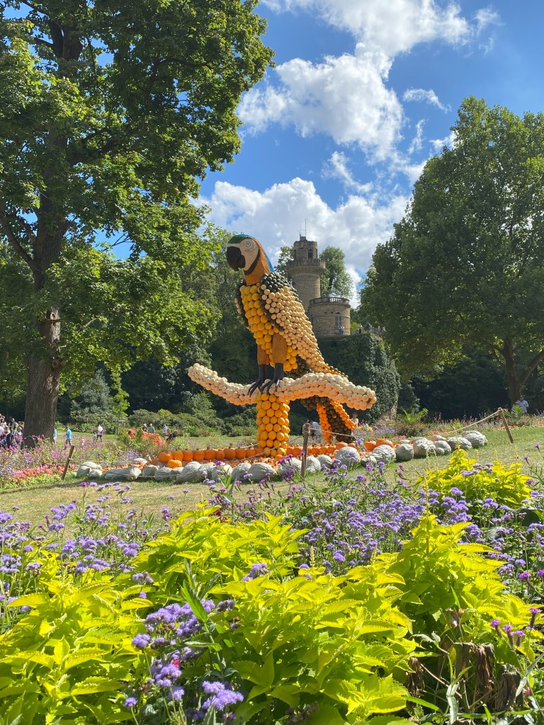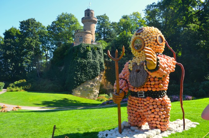 Glücklicherweise haben wir das einzige schöne Wochenende im Oktober erwischt, denn von unserem Parkplatz mussten wir durch die komplette Innenstadt laufen und am Schloss noch etwa eine halbe Stunde anstehen, um in den Park zu kommen. Bei dem guten Wetter sind eben viel mehr Menschen angereist, als wir dachten. Der Eintritt kostet für Erwachsene 10 EUR, für Kinder und Studenten die Hälfte. Das ist der normale Eintrittspreis für den Park, denn in dem gibt es neben vielen solcher Events auch einen wunderschönen Blumengarten, ein Gewächshaus und Karussells aus dem 19. und 20. Jhd., von denen noch eines betrieben wird. Außerdem gibt es eine Voliere mit Flamingos und leider mehrere viel zu kleine Volieren für Papageien! Im Eintrittspreis ist außerdem der Märchenwald enthalten, in dem es vor allem Fahrgeschäfte für Kinder gibt. Vom Rapunzelturm im Märchenwald hat man zunächst den besten Überblick auf das Kürbisfest, bevor man sich in das Getümmel stürzt.