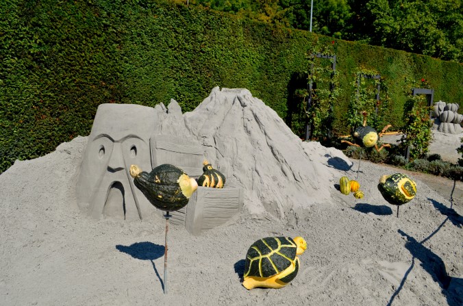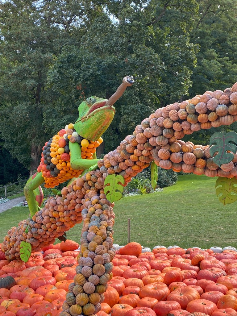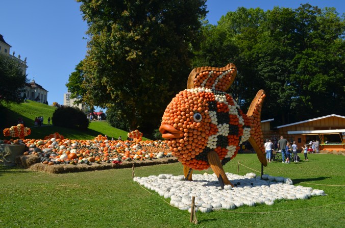 An diesem Samstag im September war es deutlich leerer als noch vor zwei Jahren, was wohl auch Corona geschuldet ist und dass Tickets nur limitiert verkauft werden. Thema der diesjährigen Ausstellung sind Unterwasserfiguren. Ihr findet Delfine, einen Orca, Kraken, Taucher, einen Hai, in dessen Maul ihr euch fotografieren lassen könnt, Arielle, Spongebob und den Regenbogenfisch aus Kürbissen gebaut. Darüber hinaus gibt es natürlich wieder einiges aus Kürbissen zu kaufen wie Waffeln, geröstete Kerne, Pommes, Suppe, Prosecco, Schorle oder verschiedenste ganze Kürbisse. Für besondere Events wie das Kürbisschnitzen für Kinder oder das Wiegen der schwersten Kürbisse war ich im September wohl noch zu früh dran, immerhin dauert die Ausstellung von Ende August bis Anfang Dezember über 3 Monate an! Für einen Eintritt von 4,50 € als Student lohnt sich der Besuch alle Male!