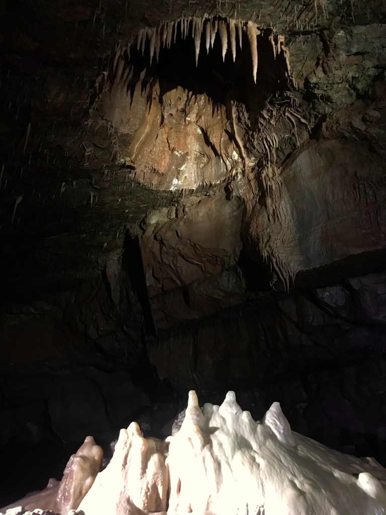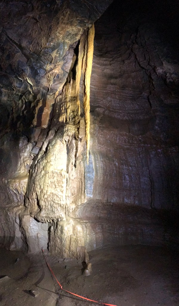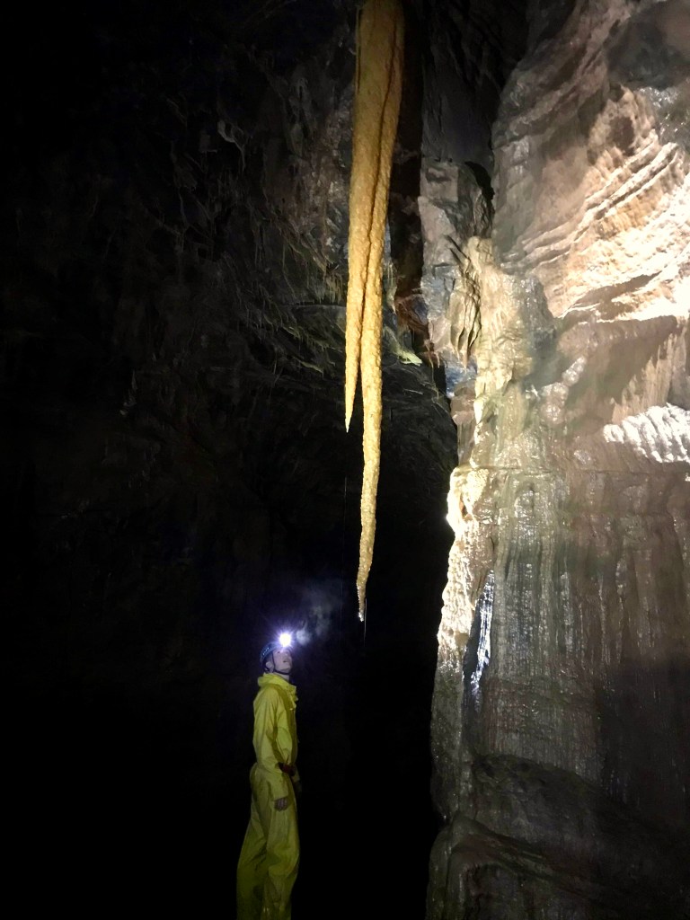 Die gesamte Höhle ist 50 km lang, wir sind natürlich nicht die volle Länge gewandert. Ich spreche hier nur über unsere Route. Direkt am Eingang liegt die Big Chamber, wortwörtlich eine große Kammer. In den meisten Gängen kann man sich aufrecht bewegen, wir sind ihnen zu einem Stalagmiten namens Wedding Cake und dem größten Stalaktiten der UK gefolgt. Letzterer wurde laut unterschiedlicher Geschichten entweder von Studenten oder vom BBC abgebrochen und musste wieder angeklebt werde. Weil öfter Tropfsteine abgebrochen werden, sind die Wege mittlerweile mit rotem Band markiert. Weiter ging es vorbei an einem unterirdischen Wasserfall in die sogenannte Salubrious Passage.
