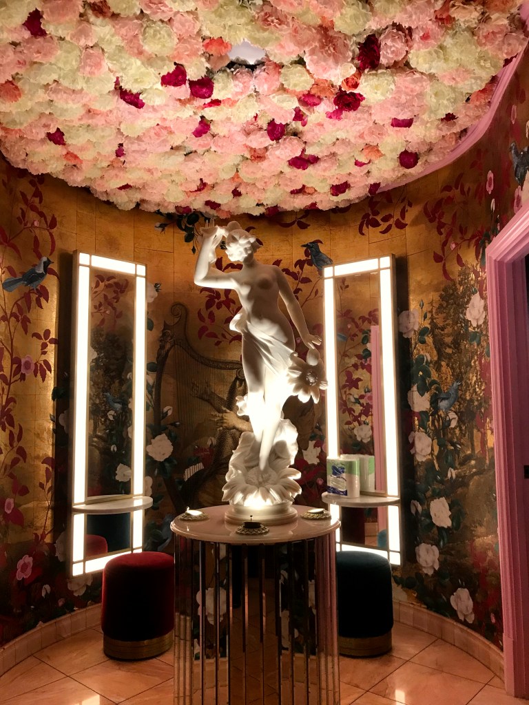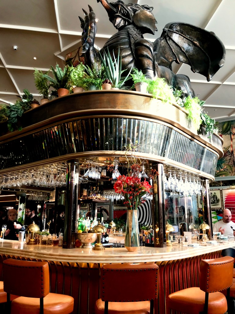 Das Ivy Cardiff ist in seiner Ausstattung wirklich besonders mit dem bronzenen Drachen über der Bar direkt am Eingang. Die Treppen sind verspiegelt, im Obergeschoss steht ein Kirschblütenbaum und im Badezimmer eine Marmorstatue unter der Decke voller Blumen. Das Essen stand dem in nichts nach, es war etwas extra und sehr gut, aber nicht sonderlich teuer. Es gab auch eine vegetarische Karte, von der ich den Halloumi mit Salat, Humus, Soße und Kürbiskernen und dazu Zucchini-Pommes bestellt habe. Davon wurde ich tatsächlich satt, beides war extrem lecker und für £20 fand ich das total okay.