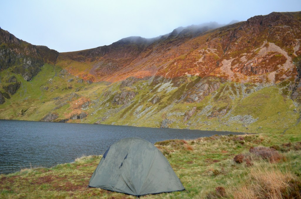 Als wir auf dem Minffordd Path aufbrachen, war das Wetter diesig, regnerisch und kalt. Wir folgten dem langen Aufstieg aus Treppen, der einem in dem wunderschönen Wald entlang des Wasserfalls fast schon leicht fällt. Bis zum See haben wir eine knappe Stunde gebraucht. Der Wanderweg führt nicht direkt daran vorbei, aber einige leicht zu findende Pfade. Mit Einbruch der Dunkelheit haben wir am See unser Zelt aufgebaut und sind am nächsten Tag dem Pfad zurück zum Wanderweg gefolgt. Der führt ab hier steil auf den Krater und auf dem Bergrücken entlang.
