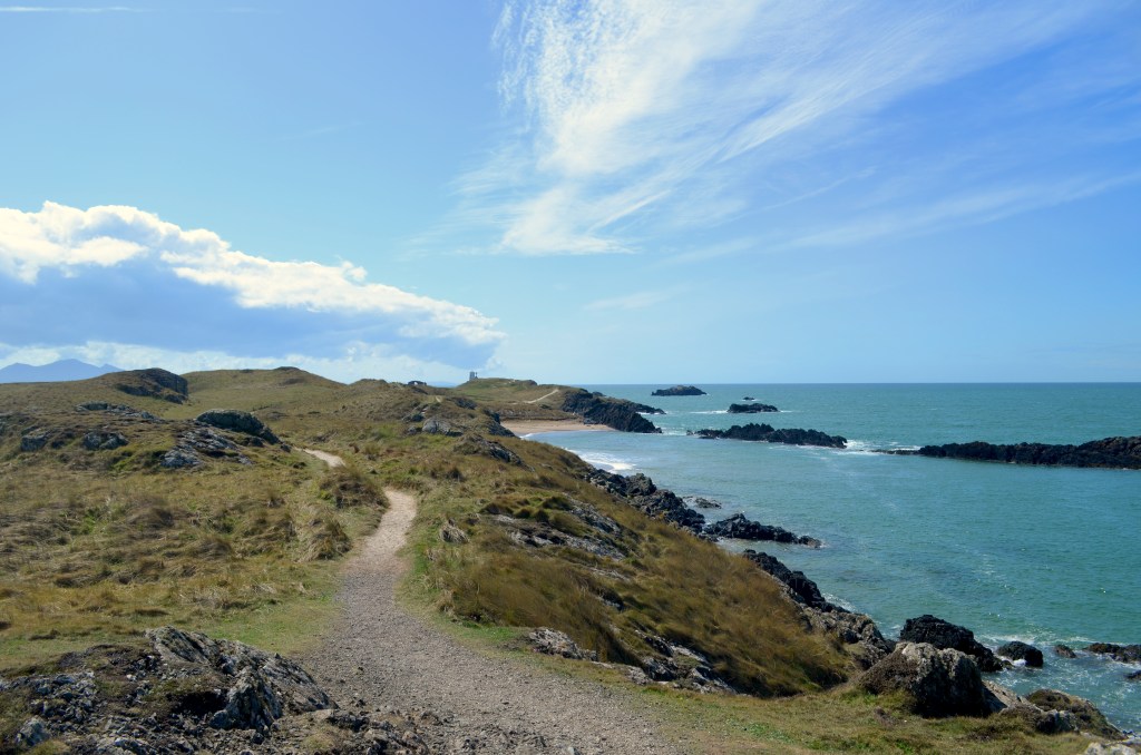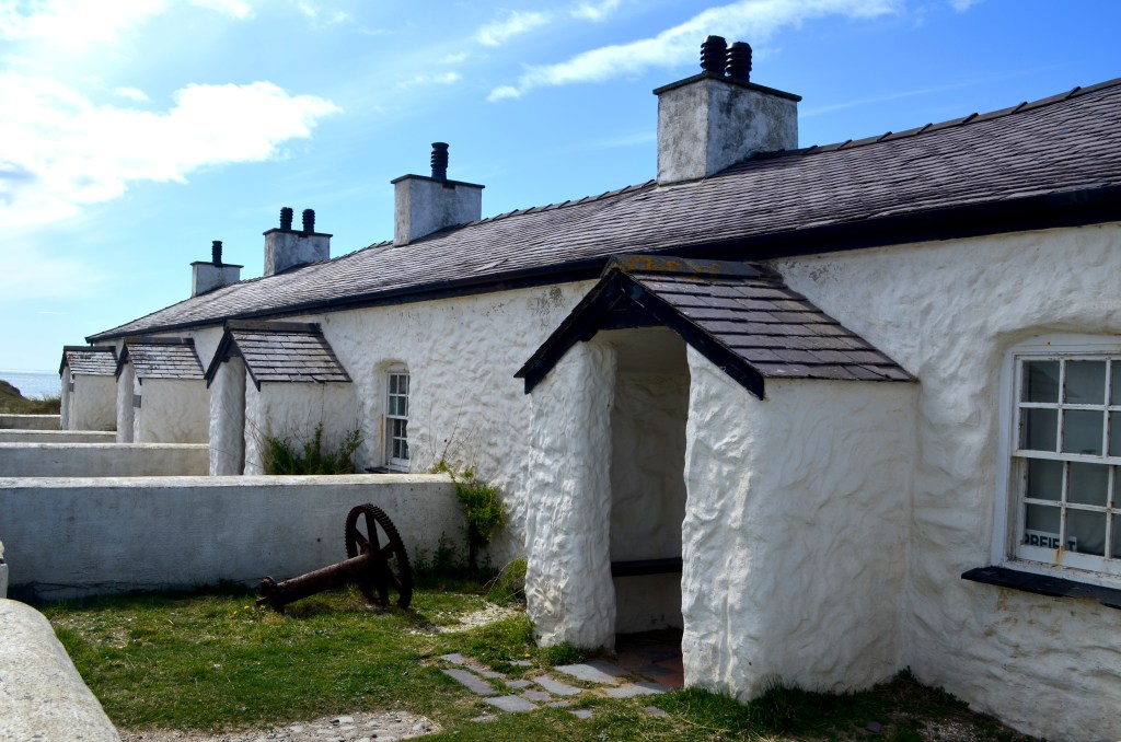 Wir kamen an einer Kirchenruine vorbei und sind nach dem großen Twr Mawr Leuchtturm weiter zum kleineren Twr Bach gegangen. Außer den beiden Leuchttürmen, einem Bootshaus und ein paar aneinandergereihten Seefahrerhütten gibt es auf der Insel keine Gebäude. So groß ist die Insel aber auch nicht. Dafür strahlt sie mit ihren Gräsern, türkisblauem Wasser und weißen Gebäuden ein absolutes Urlaubsgefühl aus. Gut, dass wir heute auf Anglesey sind, denn wir konnten von hier zugucken, wie sich über Snowdonia die Wolken abregnen. Ich beneide wirklich diejenigen, die hier an diesem schönen Tag mit ihrem Segelboot in einer kleinen Bucht geankert haben! Ein bisschen erinnert mich die Insel an die Nordsee und ein bisschen an die Azoren.