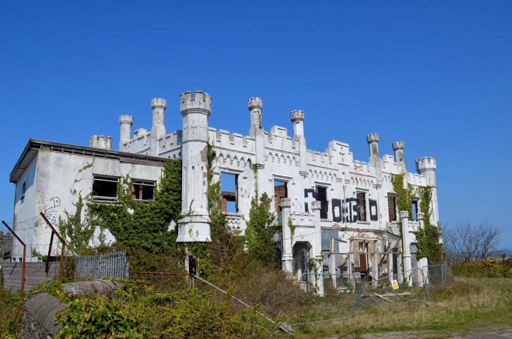 Bevor wir weiter zum South Stack fuhren, wollten wir noch einen Lost Place erkunden, der von außen aussah wie ein Schloss. Wegen Vandalismus‘ war das aber gut abgesperrt und wir kletterten über die alte Schlossmauer. Wir schätzen, dass ein Teil des Geländes tatsächlich ein altes Schloss oder Dorf war, der weiße Teil aber nur zum Protz angebaut wurde. In den Anbau kam man hinein, in den vermutlich historischen Teil aber nicht. Wir mussten uns mit einem Blick über die zusätzliche Mauer begnügen, hinter der es aber eh sehr wüst aussah.