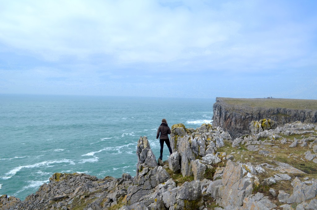 Der Pembrokeshire Coast Path gilt als einer der schönsten Abschnitte des Wales Coast Path und hier wollten wir heute ein Stück wandern. Wir starteten wieder an der Green Bridge, wollten uns die Aussicht aber für das bessere Wetter später aufheben. Ein Großteil des Weges führte über den Übungsplatz, vorbei ein Panzerattrappen als Beschussziele. Was erst noch witzig war, wurde bald nervig, denn man sollte nicht von den Wegen abweichen und hat damit von der Küste kaum etwas gesehen. Dabei war die Küste voller faszinierender Felsformationen wie den Stack Rocks. Mein Highlight war aber die St. Govan’s Chapel, wie sie in den Fels gebaut wurde, die Aussicht auf die Küste und die Höhlen rundherum. Am nächsten Strand bogen wir zu den Lilly Ponds ab, den zwischen zwei Felsen unmittelbar an den Strand grenzenden Teichen. Die Wanderung war mit 15 km etwas länger als gedacht und zu allem Übel zog auch noch Nebel auf. Da hatten wir uns die Green Bridge extra für besseres Wetter aufgehoben und nun sieht man sie gar nicht mehr. Planänderung, dann klettern wir halt auf die Felsbrücke. Hier kann man auch richtig klettern, aber den zwei rostigen Nägeln möchte ich 100 m über der See lieber nicht mein Leben anvertrauen.