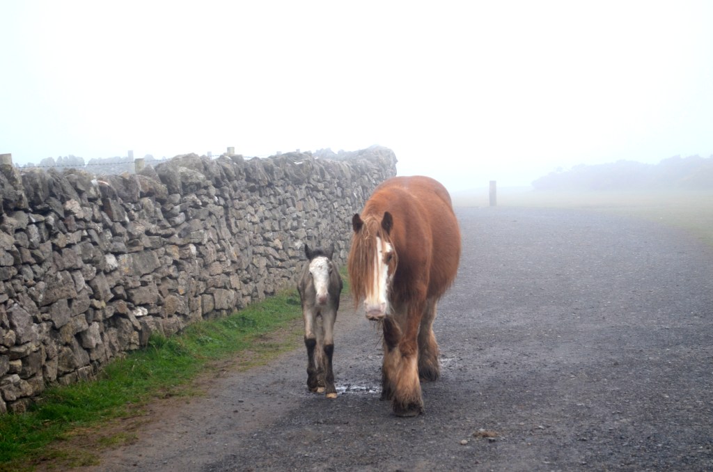 Der Wormshead ist eine Insel am Rhossili Beach, einer der wohl schönsten Gegenden auf der Halbinsel Gower. Leider konnte man davon am Morgen noch nicht viel sehen, denn es war wieder einmal verdammt neblig. Auf dem Weg zum Wormshead kamen uns immer wieder verwahrloste Pferde mit ihren Fohlen entgegen, die sich hier wohl selbst überlassen werden. Es hatte schon eine gewisse Stimmung, als uns an diesem einsamen Morgen auf dem Wanderweg die Pferde aus dem Nebel entgegenkamen. Die Insel ist nur bei Ebbe begehbar; Schilder am Übergang zeigen jeden Tag die sicheren Zeiten an und warnen davor durch gefährliche Strömungen bei Flut abgeschnitten zu werden. Wir hatten Glück, heute sollte der Übergang ab 08:30 Uhr sicher sein und wir hatten es 09:00 Uhr.