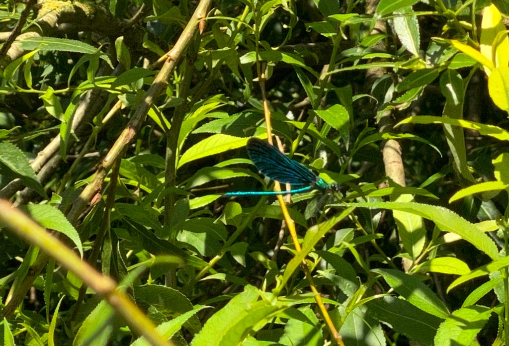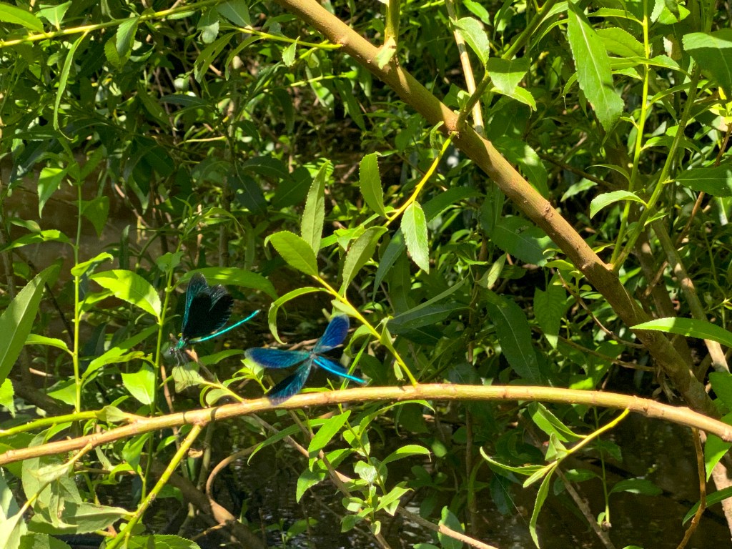 Die Oste bietet eine überraschend vielfältige Flora und Fauna. Am meisten haben mich die sogenannten Blauflügel-Prachtlibellen beeindruckt, die mit ihren dunkelblauen Körpern und Flügeln tatsächlich prächtig aussehen und hier in Massen auftreten. Aber auch zwei Eisvögel und drei Nutrias (Biberratten) haben wir gesehen. Ein Nutria tauchte unter unserem Boot hindurch, ein anderes ist kurzzeitig vor unserem Kanu vorweggeschwommen und das dritte Tier saß nur 3 m von uns entfernt am Ufer. Auch Fischotter und Gebirgsstelzen soll es an der Oste geben, aber die haben wir nicht gesehen. Der Fluss ist seitlich von Büschen eingerahmt und leicht bis teils stark überwachsen, was die Tour idyllisch und gleichzeitig abenteuerlich macht. Leider plagten uns aber auch Stechfliegen, mal eben am Ufer halten und ein Picknick im Schatten machen war nicht drin. Auch im Boot wurden wir komplett zerstochen und natürlich kamen vereinzelt auch noch Wespen dazu.