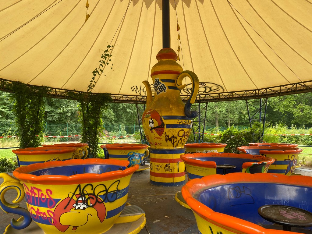 Das originale DDR-Riesenrad steht momentan leider nicht. Weil es nie festgezogen wurde und sich über die Jahre im Wind drehen konnte, ist es nie korrodiert und bis heute funktionsfähig. Deshalb wurde es jetzt abgebaut, soll restauriert werden und 2026 in neuem Glanz erstrahlen, wenn der Spreepark als Volkspark wiedereröffnet wird. Die Pläne dafür sind wunderschön, sie verbinden die noch vorhandenen reparablen Fahrgeschäfte mit neuen Spielplätzen, Kunst, Kultur und Natur. Auch das Teetassenkarussell lässt sich noch von Hand bewegen, weshalb man es auf der Führung eigentlich fahren kann, aber letzten Sommer war es zum Schutz seltener Wespen gesperrt. Der einzige Freizeitpark Ostdeutschlands schloss 2001, weil wegen des extremen Preisanstiegs nach der Wende von 1,05 DM auf 30 DM und der fehlenden Parkplätze immer weniger Besucher kamen. Bis heute ist der Spreepark nur mit der S-Bahn und einem ordentlichen Fußmarsch erreichbar.