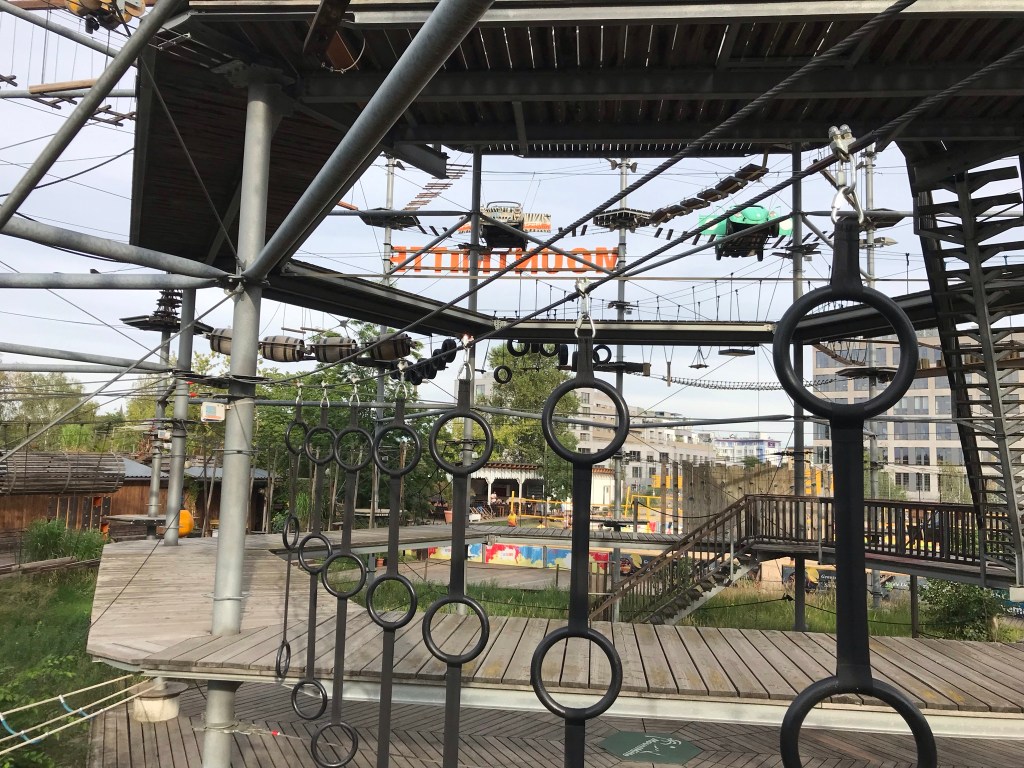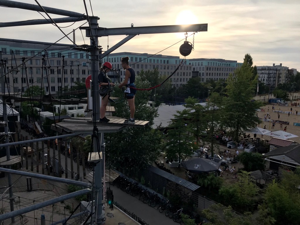 Der Mount Mitte ist ein Hochseilgarten im Bezirk Mitte, auf den ich schon lange ein Auge geworfen hatte. Es ist eher ein 3-stöckiger Hindernisparcours als ein Klettergarten, denn man läuft über rollende Fässer, fährt auf Surfbrettern und Fahrrädern oder krabbelt durch Trabbis. Ganz oben hat man einen tollen Blick auf den Fernsehturm und kann von hier im Skyfall 13 m an einem Seil eingehakt in die Tiefe springen. Allerdings greift dabei so schnell der automatische Stopp, dass man eigentlich keinen freien Fall hat. An einem Mittwochabend hatten eine alte Schulfreundin und ich den Parcours fast für uns, weshalb wir nirgends warten mussten und die teils schwierigen Elemente mehrfach probieren konnten. Die verlangen einem teilweise nämlich echt Kraft und Geschick ab. Zusätzlich gibt es eine Riesenschaukel, die einen 8 m in die Höhe zieht, fallen und schaukeln lässt. Eigentlich muss man die extra zahlen, da wir aber die Letzten waren, hat uns der nette Mitarbeiter kostenlos reingelassen. Insgesamt haben wir selbst als Studenten jeweils 26,50€ für 150 min gezahlt. Für mich war es schön es mal gemacht zu haben, aber zu teuer für ein zweites Mal.